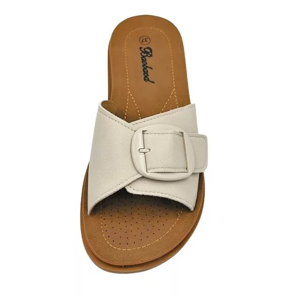 Elegáns ONYX női csatos papucs beige színben, állítható tépőzárral, puha talppal. Kényelmes, divatos nyári papucs minden alkalomra.