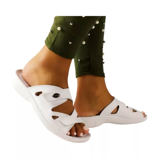 Dr. Monte Bosco 1406 hosszú ideje a legkedveltebb gyógypapucsok sereghajtója. Az élmezőnyben van ár-érték arányban illetve tartósság tekintetében is. Fenntartható olasz manufaktúrában készül. Fehér színe miatt nem csupán otthoni, hanem munkahelyi viseletre is ajánljuk. Dupla, erős tépőzárral állítható. Felsőrésze fedett bőr, belsőrésze és talpbetétje is egyaránt bőr. A talpbetét speciális nagyon puha alászivacsolt, anatómiai kialakítással bír, nem mellesleg könnyen is tisztítható. Talpa rugalmas gumiból készült, anti shock, elnyeli az ütődéseket, védi az izületeket valamint alátámasztja a gerincet.