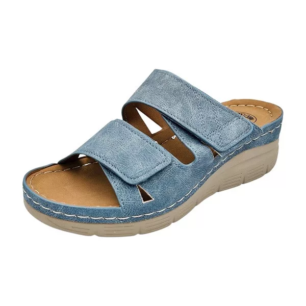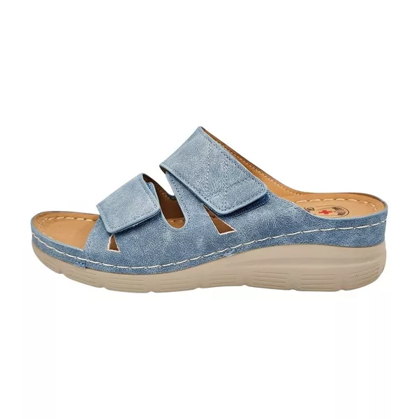 A Florence dupla tépőzáras telitalpú női papucs világoskék színben ideális választás azoknak, akik a kényelmet nőies megjelenéssel szeretnék ötvözni. A két külön állítható tépőzáras pánt lehetővé teszi, hogy a papucs szélességét a láb formájához igazítsd, így stabilan tart, nem csúszkál, és kényelmes marad napközben is.