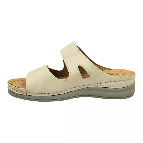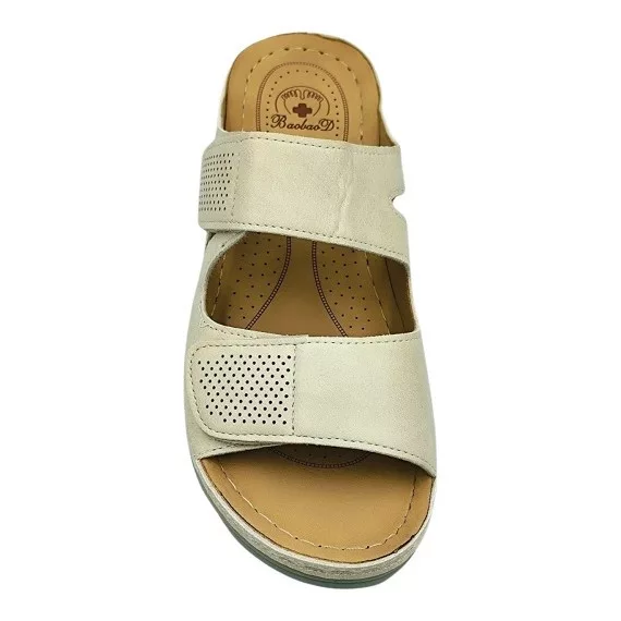 A MYKONOS dupla tépőzáras női papucs beige színben kényelmes és praktikus választás a mindennapokra. A két állítható tépőzáras pánt lehetővé teszi a pontos illeszkedést, így stabil tartást biztosít járás közben.