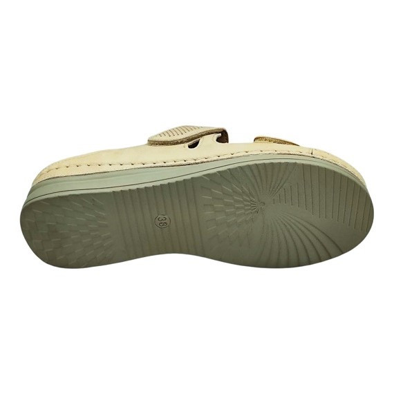 A MYKONOS dupla tépőzáras női papucs beige színben kényelmes és praktikus választás a mindennapokra. A két állítható tépőzáras pánt lehetővé teszi a pontos illeszkedést, így stabil tartást biztosít járás közben.